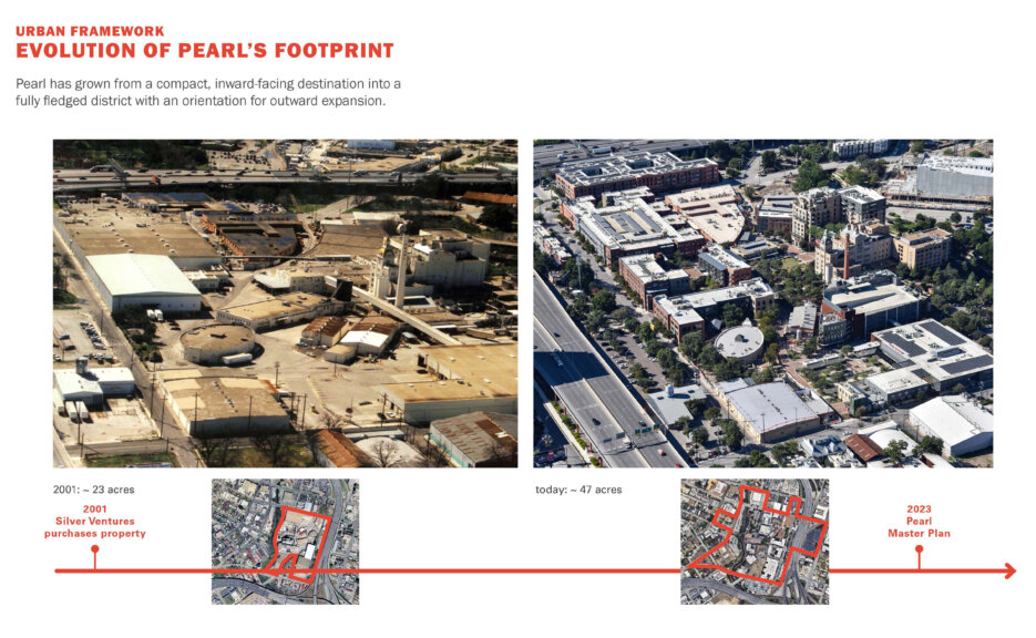 Over the past decade, Pearl has served as a living-breathing case study of successful mixed-use development both locally and globally. As Pearl plans for its future, strategies for expanding its footprint to further engage the San Antonio River, the Broadway corridor, and surrounding neighborhoods will extend Pearl’s reach and relevance with the intention of creating a more connected, walkable, socially inclusive, and economically diverse environment. The master plan serves as a north star for achieving the next phase of ambitions with innovative vertical mixed-use, missing middle housing, shared parking and multi-modal mobility.