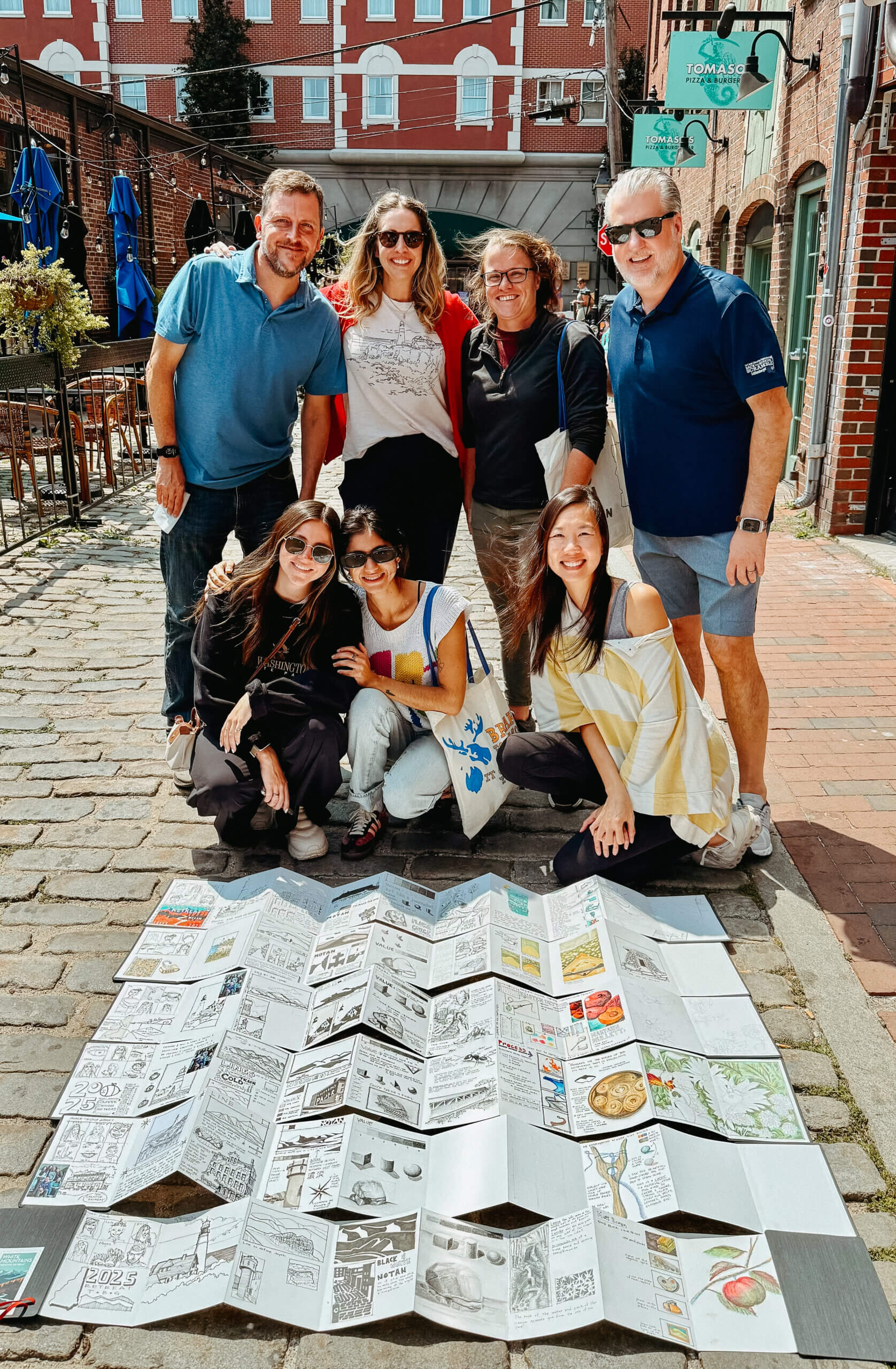The 2025 Summer Creative Retreat wrapped up with a final gathering including delicious lobster rolls at Rigby Yard, a lively spot on Wharf Street in Portland’s historic train depot. Here, each participant shared their journey with Bill Odle, unfolding their accordion sketchbooks. Page by page, they revealed their personalized creative stories from the week – landscapes in ink, forest details in pencil, color studies, and personal reflections. It was a collective showcase of how they explored place, process, and design.