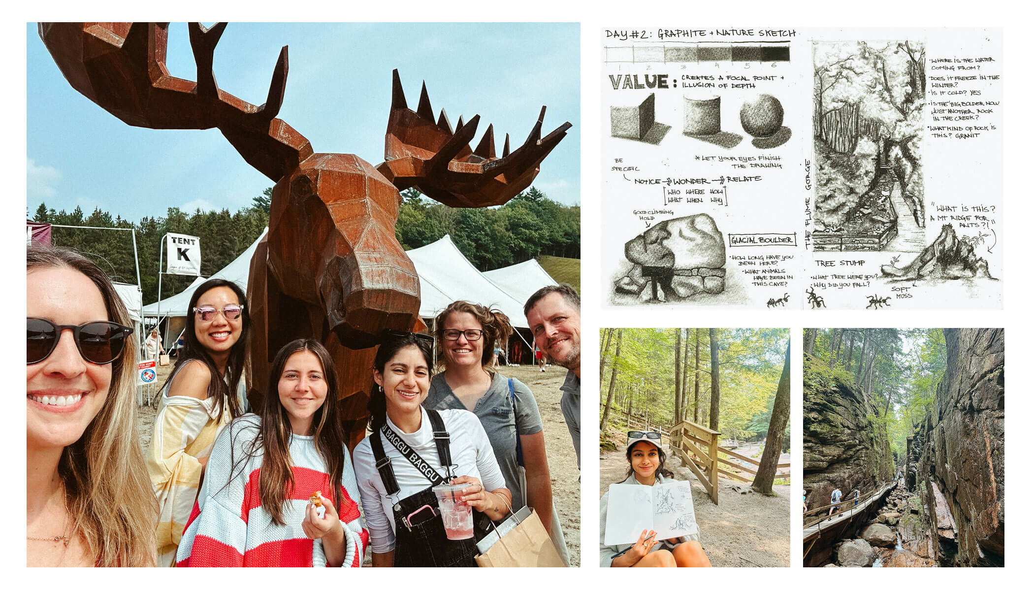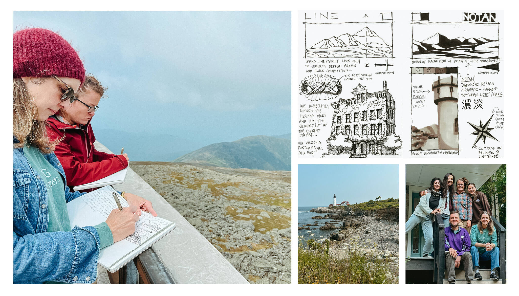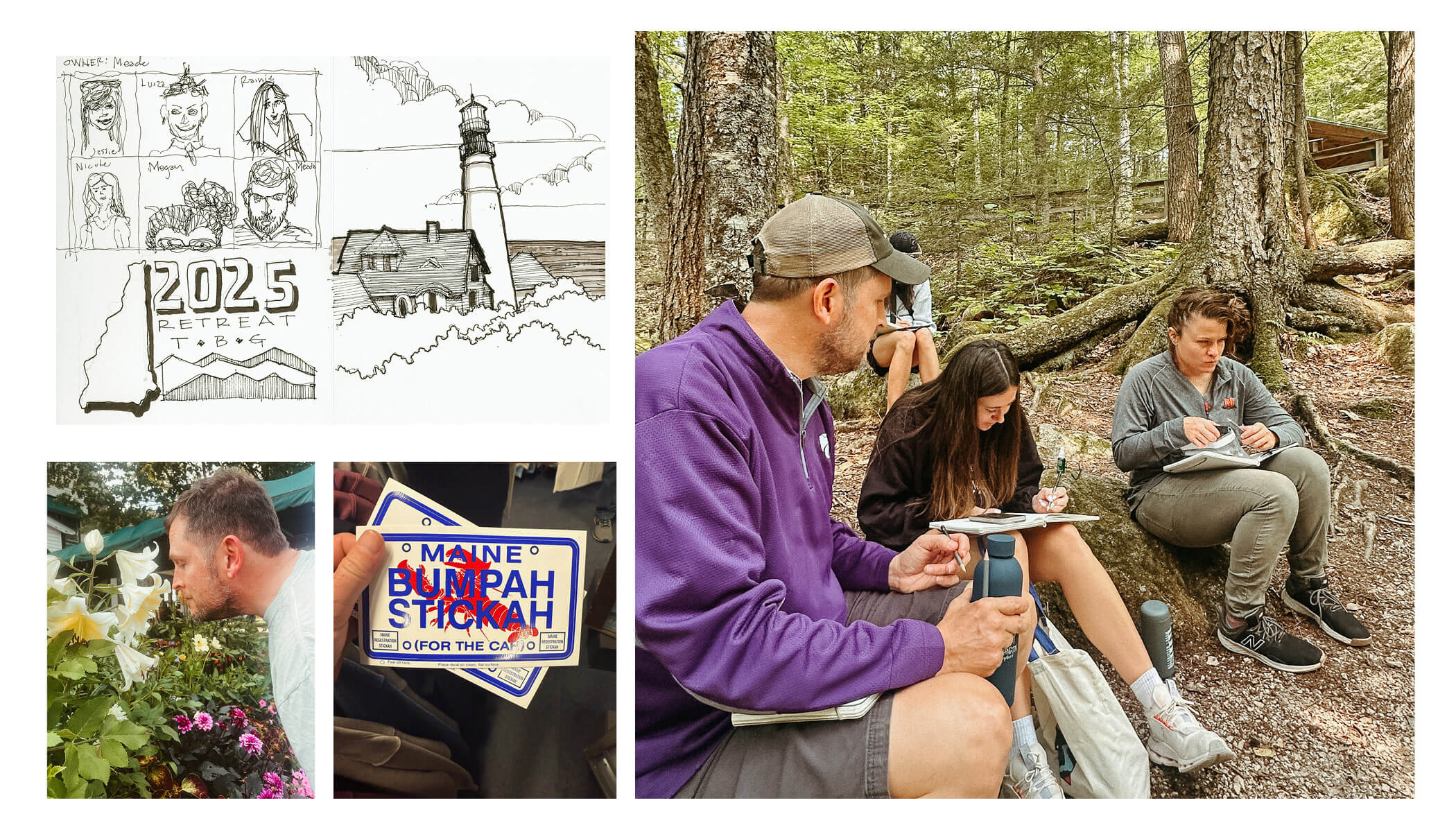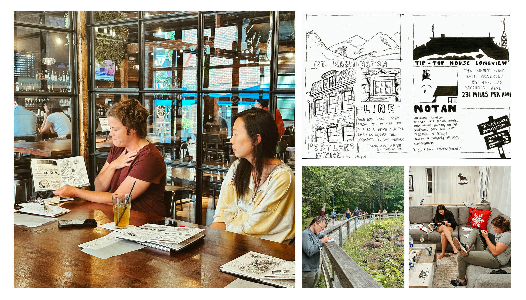 Under the shadow of New Hampshire’s White Mountains National Park, four TBG designers and two facilitators pressed pause on deadlines and meetings to sketch, hike, laugh, and reconnect with creativity. For the third year of our Summer Creative Retreat, the destination was New England. The goal, as always, was the same: step away from the rush of practice to rediscover the joy of creative exploration and process.