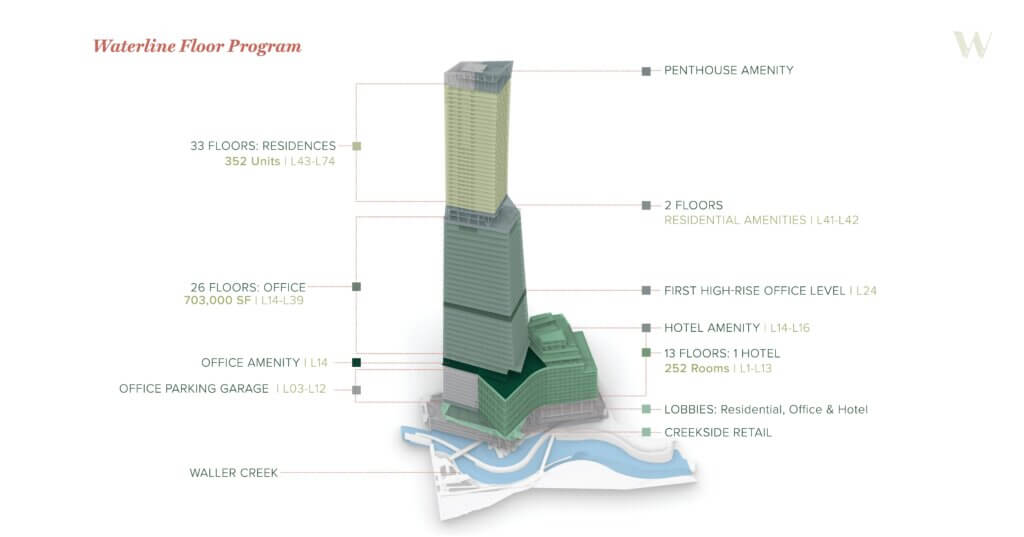 – 24,000 square feet of publicly accessible retail and restaurant space overlooking Waller Creek and Waterloo Greenway